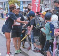 高橋勇市さんを応援する増田小学校児童 高橋さんは足を止め「夢をあきらめずに努力してください」とエール