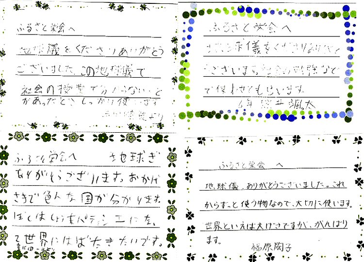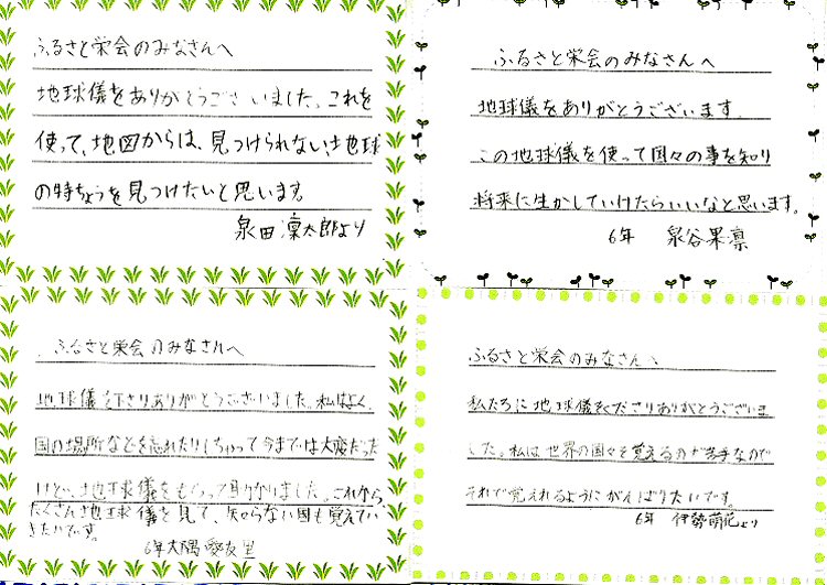 ふるさと栄会様 いつも大変お世話なっております。 さて3月14日の卒業記念品贈呈式の際に、6年生に地球儀を贈呈しました。6年生は教室で地球儀を手にとり、とても喜んでいました。地球儀を贈っていただき心より感謝申し上げます。 つきましては、6年生のメッセージのデーターと写真をお送りいたします。ご覧いただければ,ありがたいです。